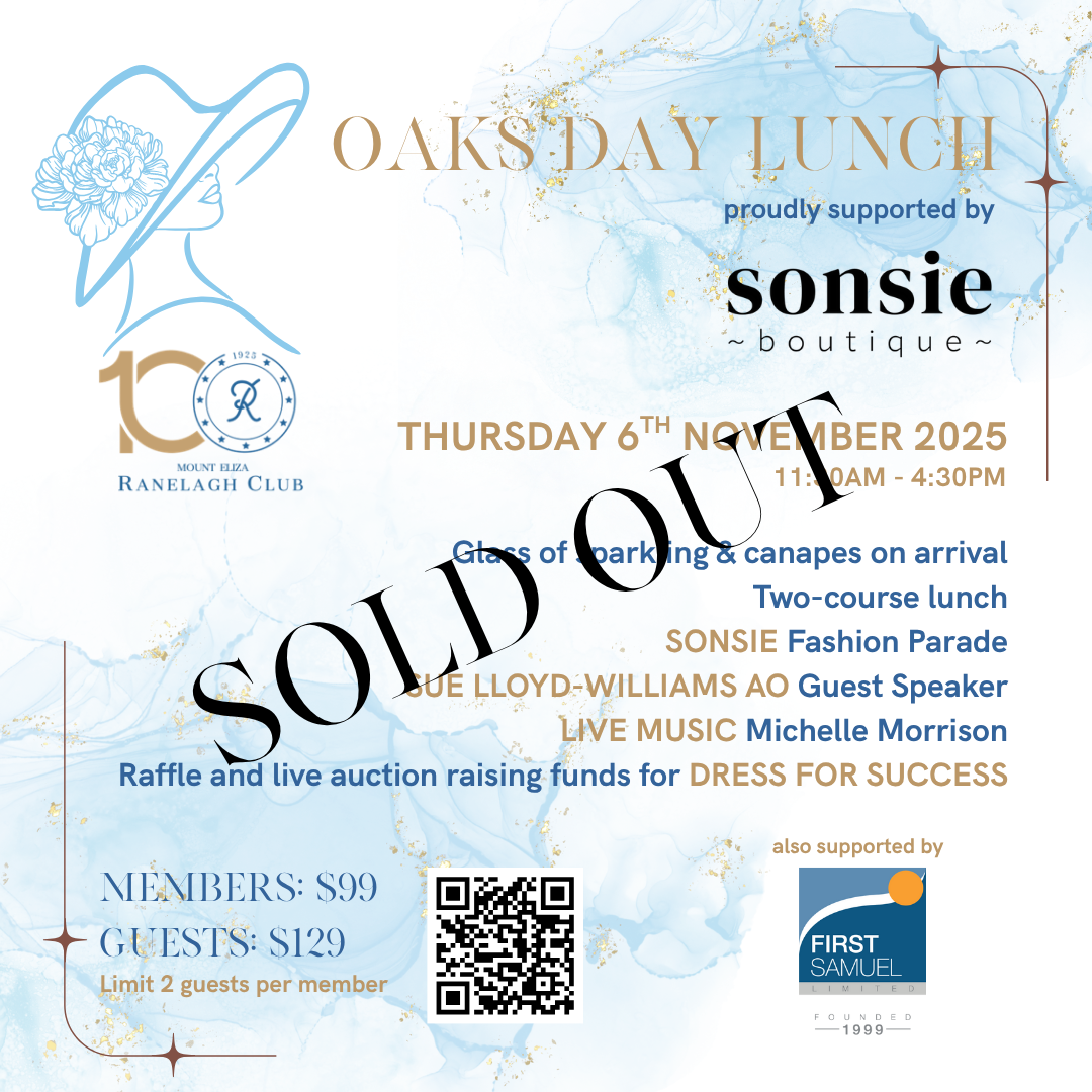 Ladies the time has come to frock up and head to the Ranelagh for our Oaks Day Lunch on Thursday 6th November. This year is going to bigger and better than ever with a fashion parade by Sonsie. Doyenne of the Spring Racing Carnival, Sue Lloyd-Williams AO, will be sharing her career highlights and behind-the-scenes stories on fashion, famous celebrities and how females led a ‘soft-revolution’ at Flemington.